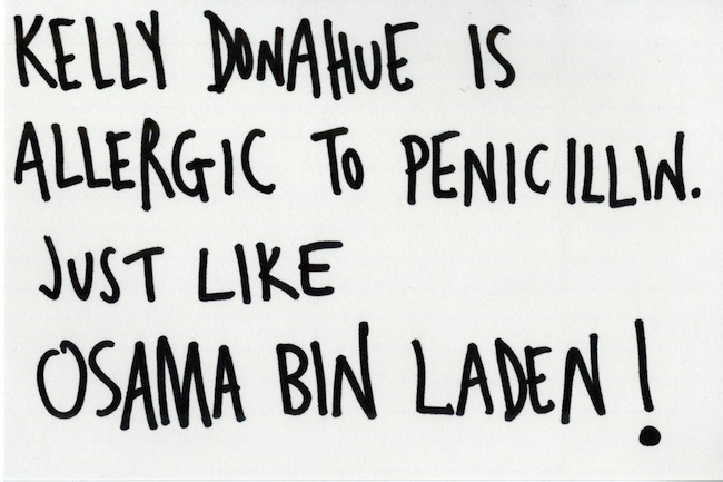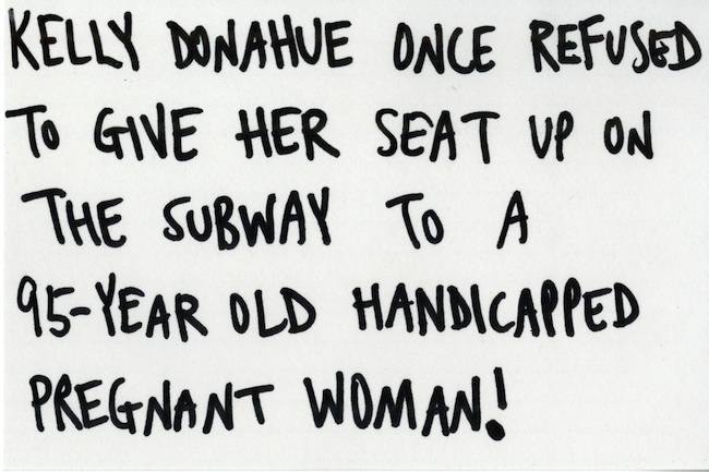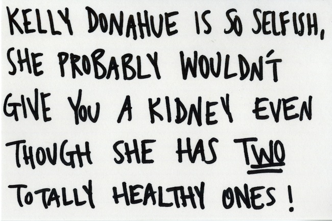 On January 7, 2011 I started a new job. I met some "girl" there named Kelly Donahue, and I immediately knew that I must defeat her (til she's dead.) I even wrote a whole journal about it. But I'm sure I'm not the only one on the whole planet who wants Kelly Donahue and her veggie burger breath to be eliminated. If you need reasons to hate Kelly Donahue, see below. If you wanna join the hatefest,